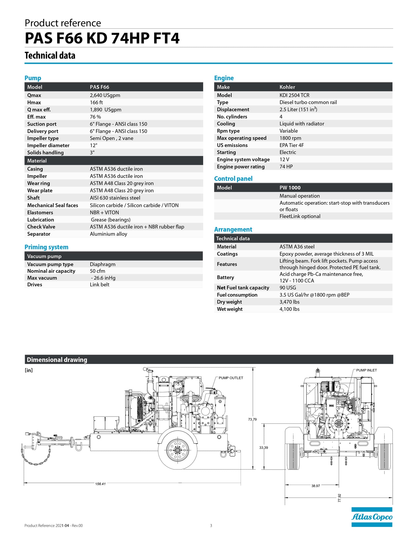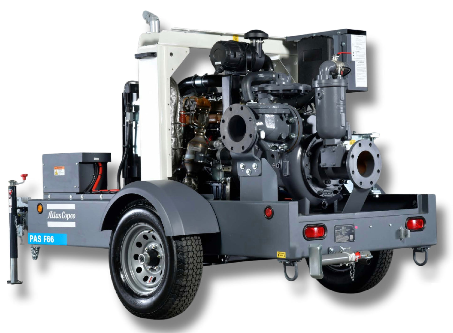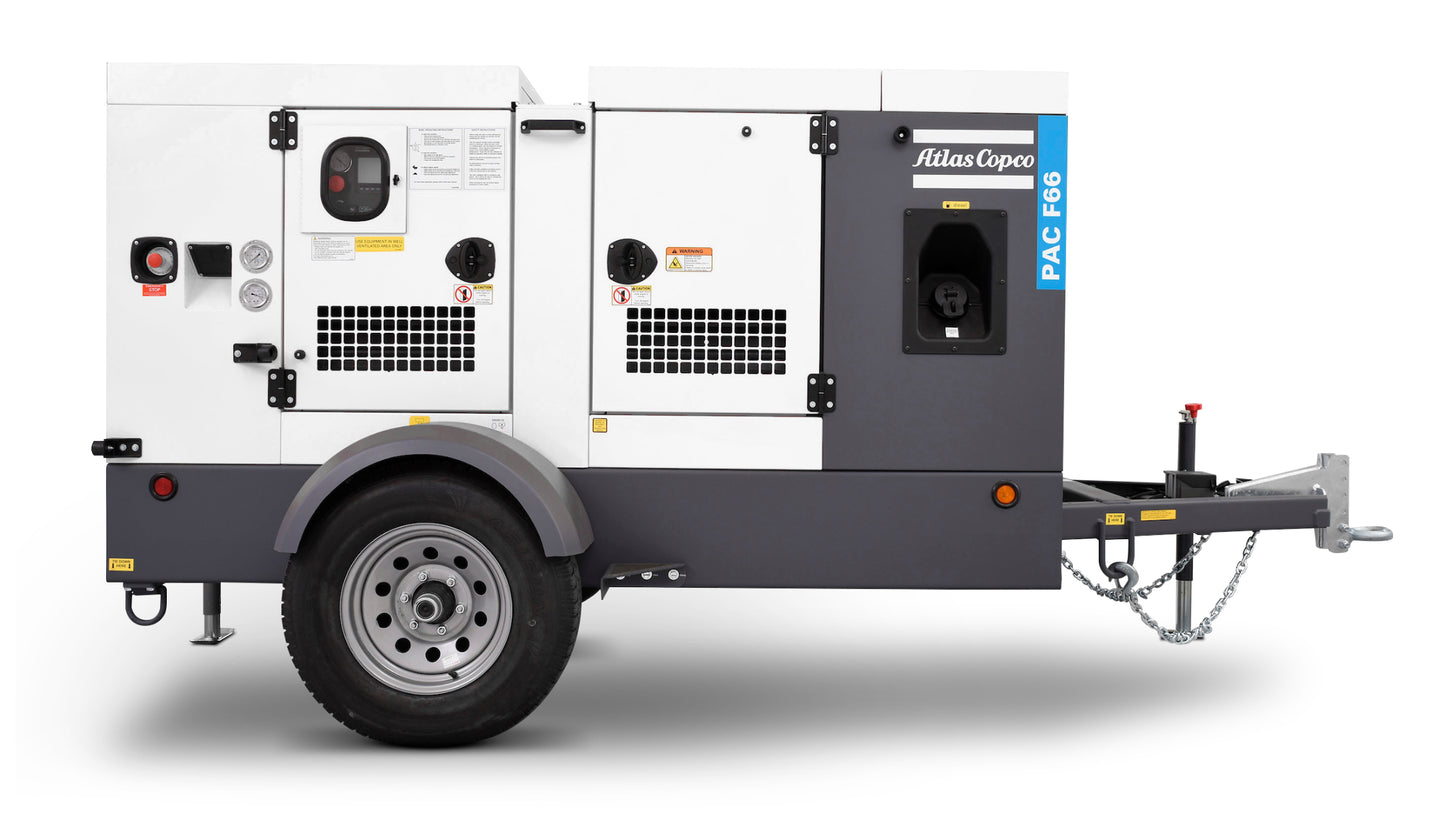 The Atlas Copco PAS F66 towable pump system combines a centrifugal pump and a separator to enable automatic priming, even with high suction heights. It efficiently removes air from the suction pipe to start pumping liquids with suspended solids. Designed for tough applications, the PAS F66 excels in the mining and oil & gas sectors, ensuring reliability, efficiency, and versatility. It's also suitable for construction, general de-watering, municipal, and general industrial applications, offering best-in-class pumping efficiency.