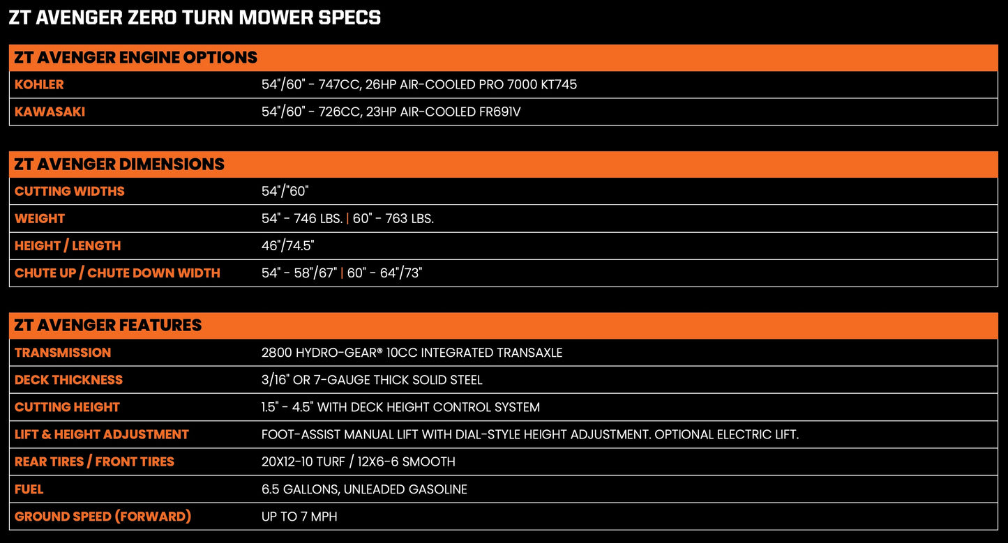FOR SALE: The ZT Avenger Zero-Turn Mower delivers a smooth, powerful mowing experience with its plush seat, fingertip controls, and exclusive steering dampening system. Built with pride in the USA, it features a robust all-steel deck, reinforced for durability, and rides on a strong 2”x2” steel rail frame. Equipped with Hydro-Drive and a choice of 54” or 60” cutting decks, it ensures precise, powerful cuts. The ZT Avenger is perfect for homeowners seeking professional-grade quality and performance at a residential price. Click here to download a PDF with full details about the ZT Avenger. Prices shown below for the models that we carry.