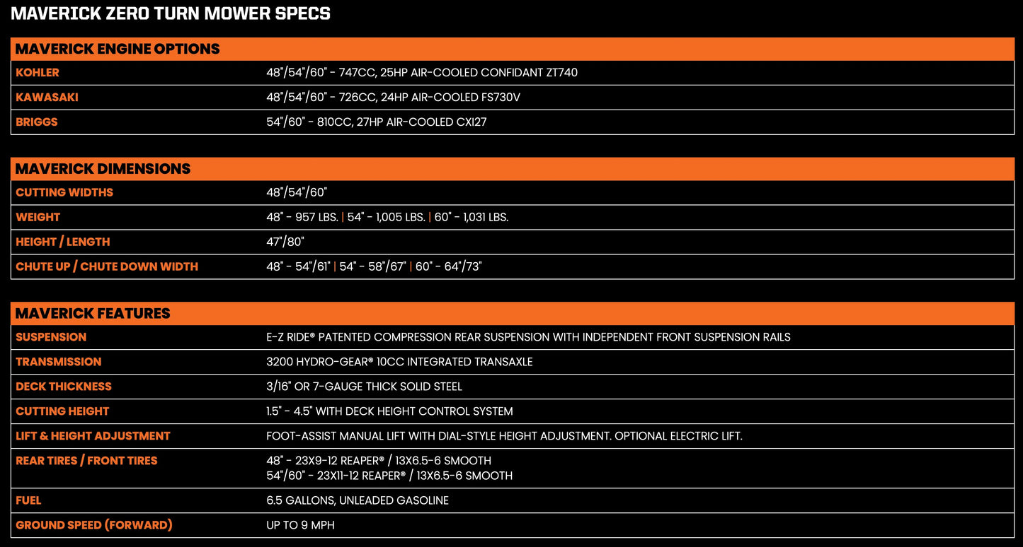 - Maverick w/ Kohler ZT740 motor + 60" deck - $8,589