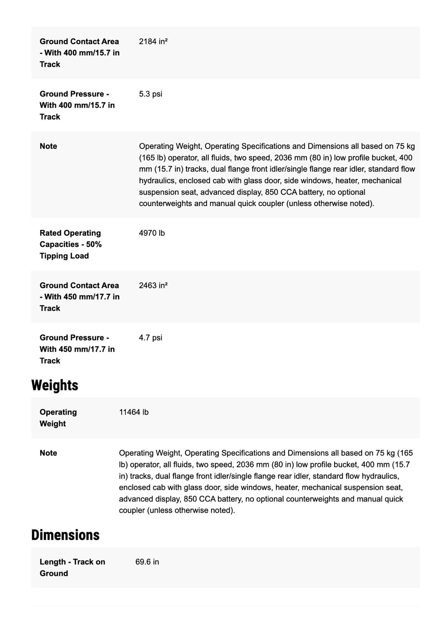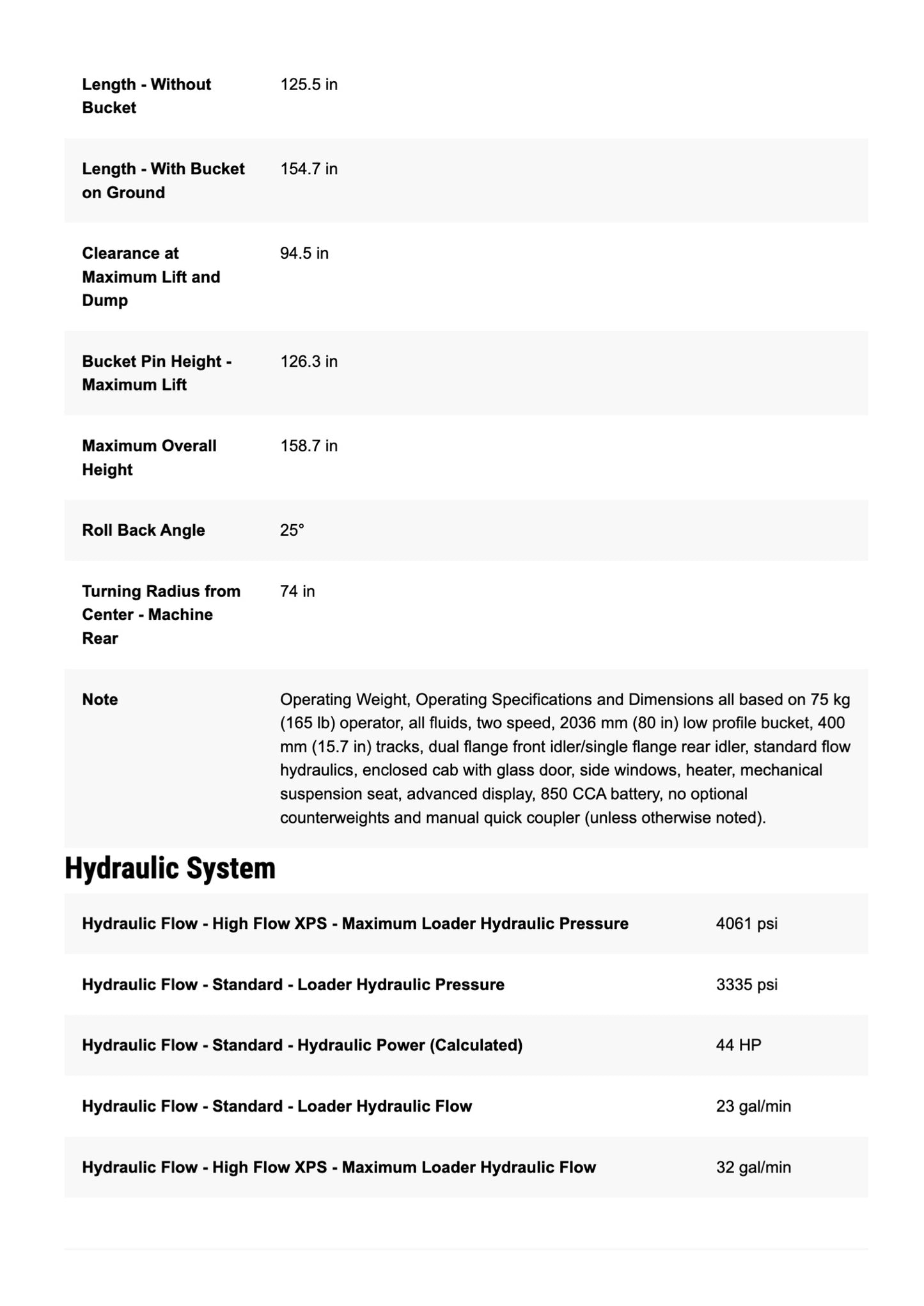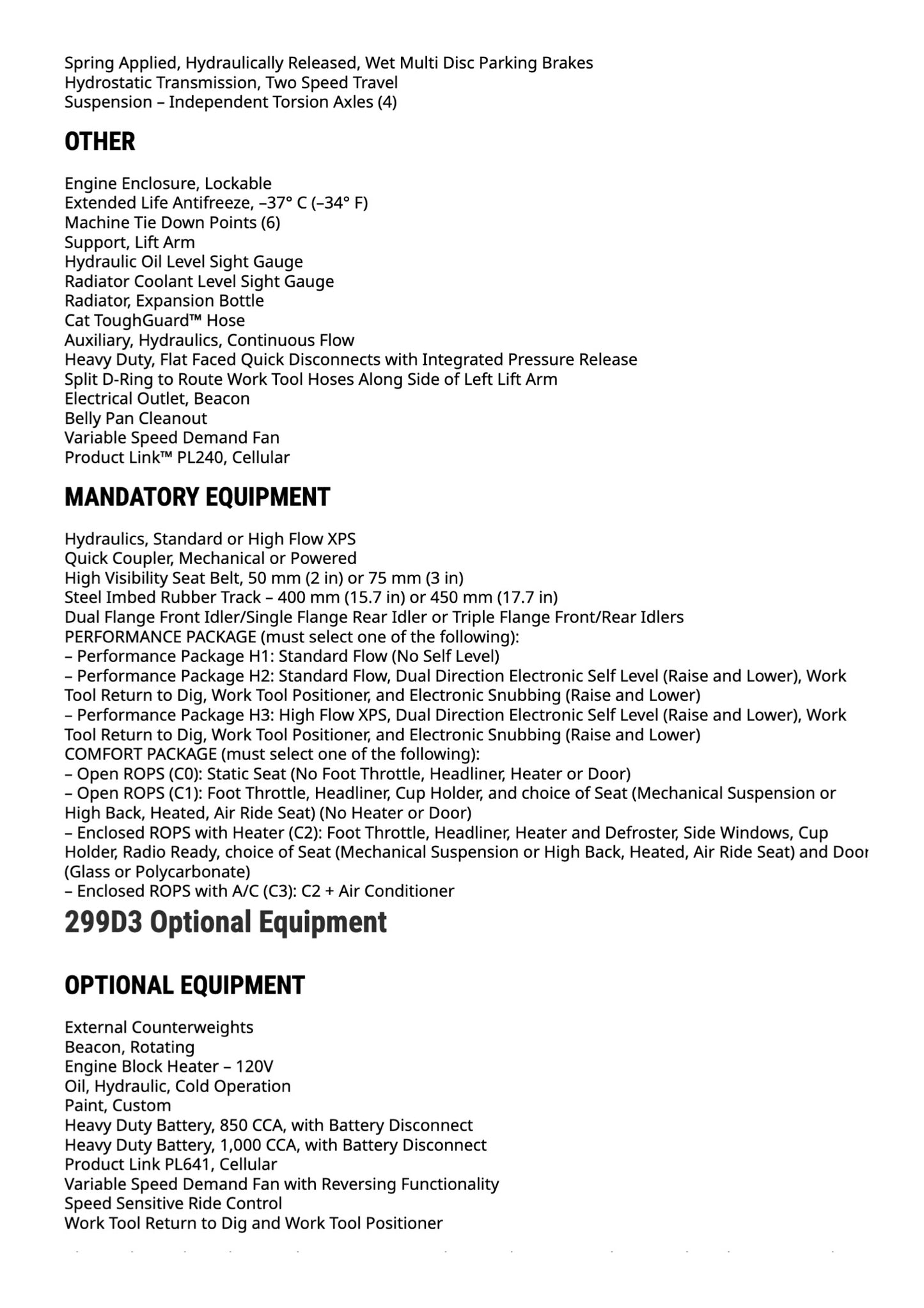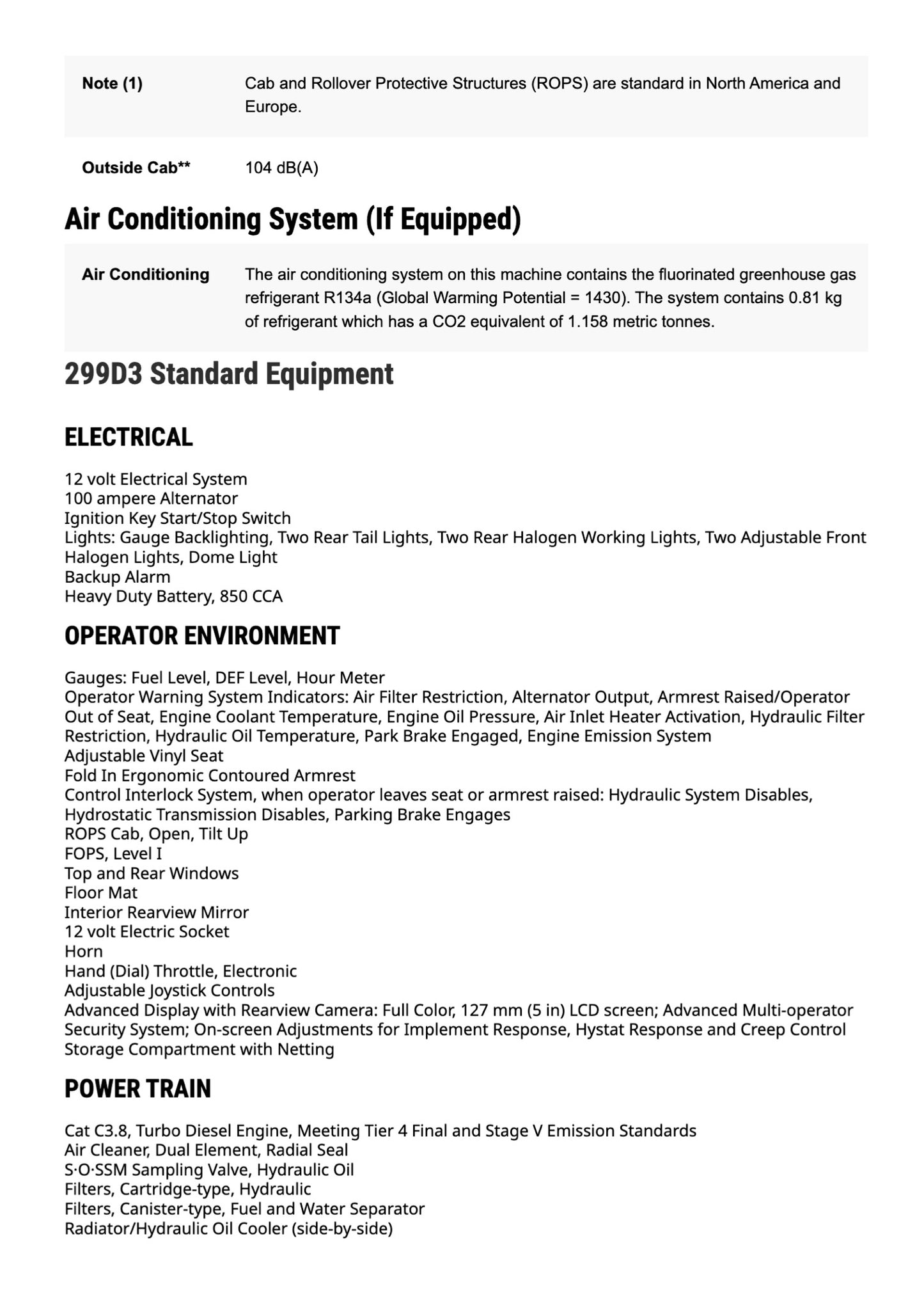 The CAT 289 and 299 skid steer loaders provide more power and lifting capacity compared to the 259D, making them ideal for mid-size construction projects requiring excavation, material handling, or powering various attachments. Engine and capacity specifications vary depending on the model, so please check the spec sheets shown for additional details.