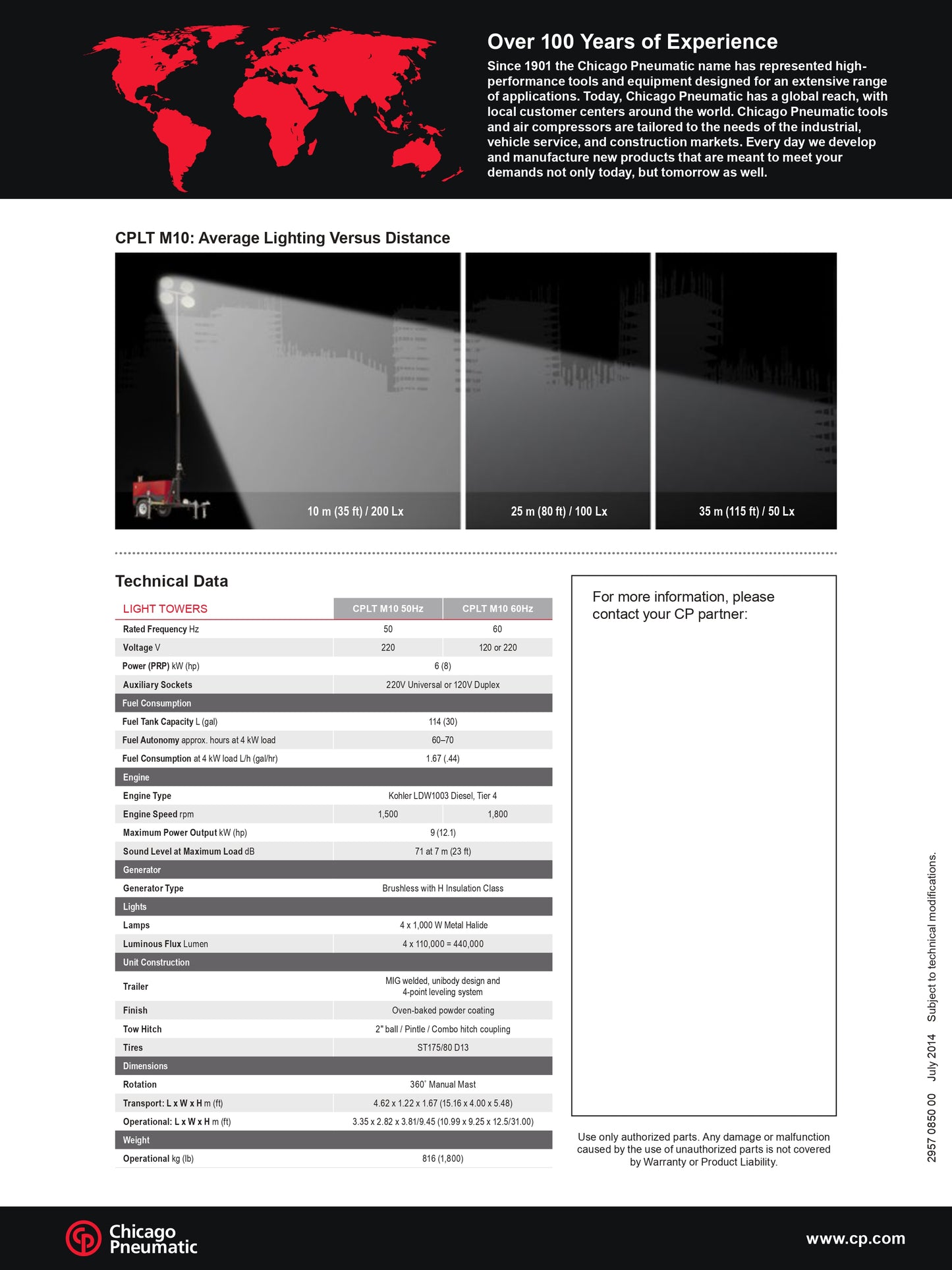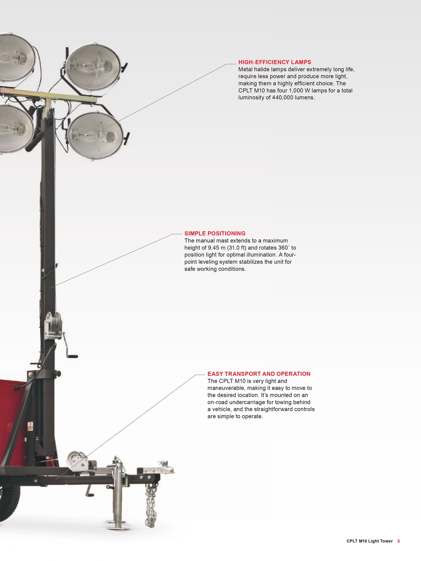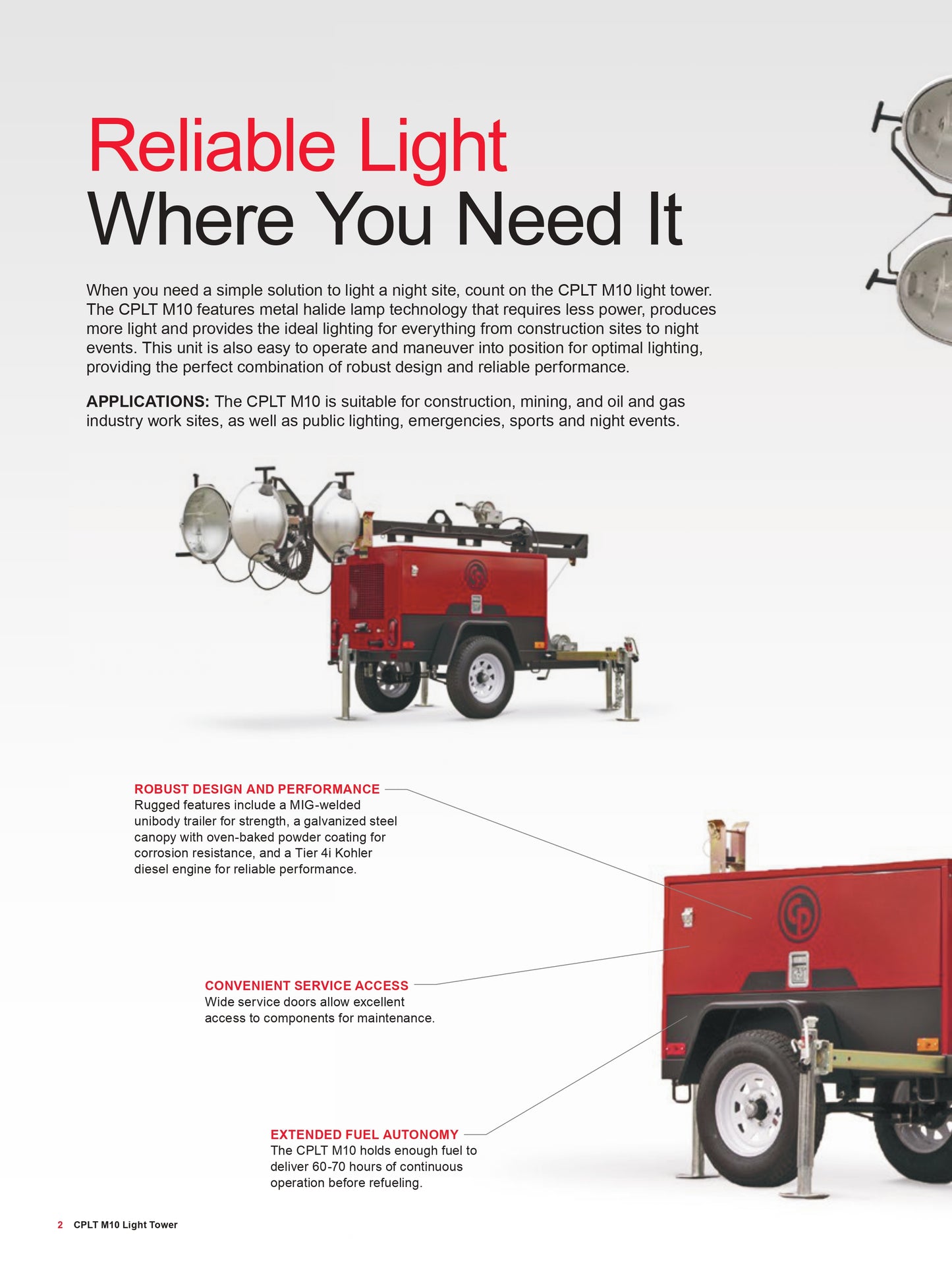 The CPLT M10 is a rugged and efficient light tower featuring a MIG-welded unibody trailer, a corrosion-resistant galvanized steel canopy, and a reliable Tier 4i Kohler diesel engine. It provides 60-70 hours of continuous operation with high-efficiency metal halide lamps producing 440,000 lumens. The manual mast extends to 31 ft and rotates 360° for optimal illumination, while wide service doors and straightforward controls ensure easy maintenance and operation. Lightweight and maneuverable, it’s ideal for construction, mining, emergency, and event applications.