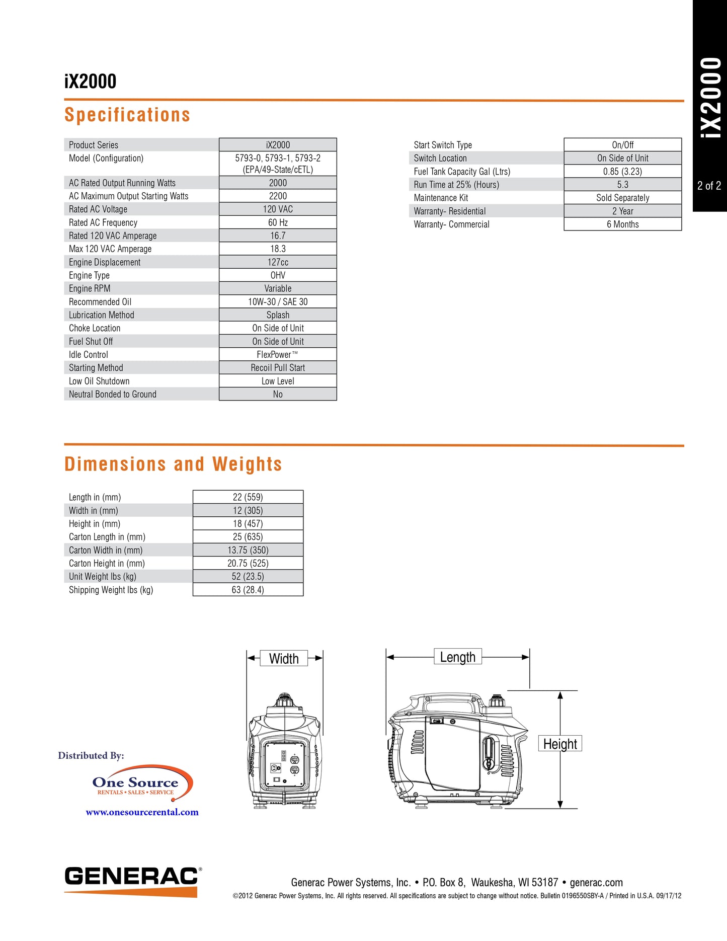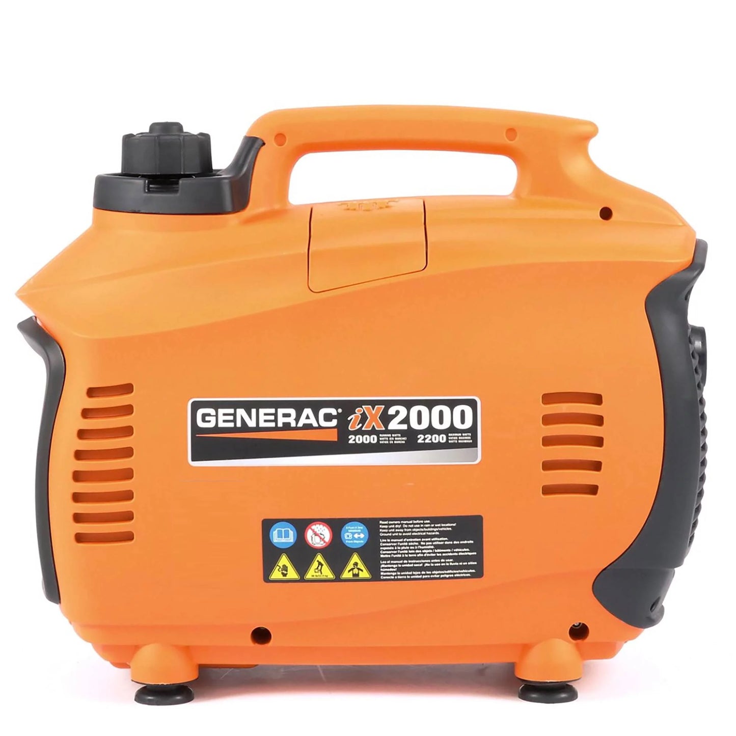 The Generac iX2000 is a 2000-watt portable inverter generator known for its clean and stable power. It features a 127cc four-stroke OHV engine with low oil shutdown, a recoil starter, and a push-button primer for easy start-up. The generator operates quietly with FlexPower™ modes for fuel conservation and has a compact, lightweight design with a fully enclosed suitcase and integrated handle. It provides up to 4.7 hours of runtime at 25% load and includes an LED status indicator and circuit breakers.