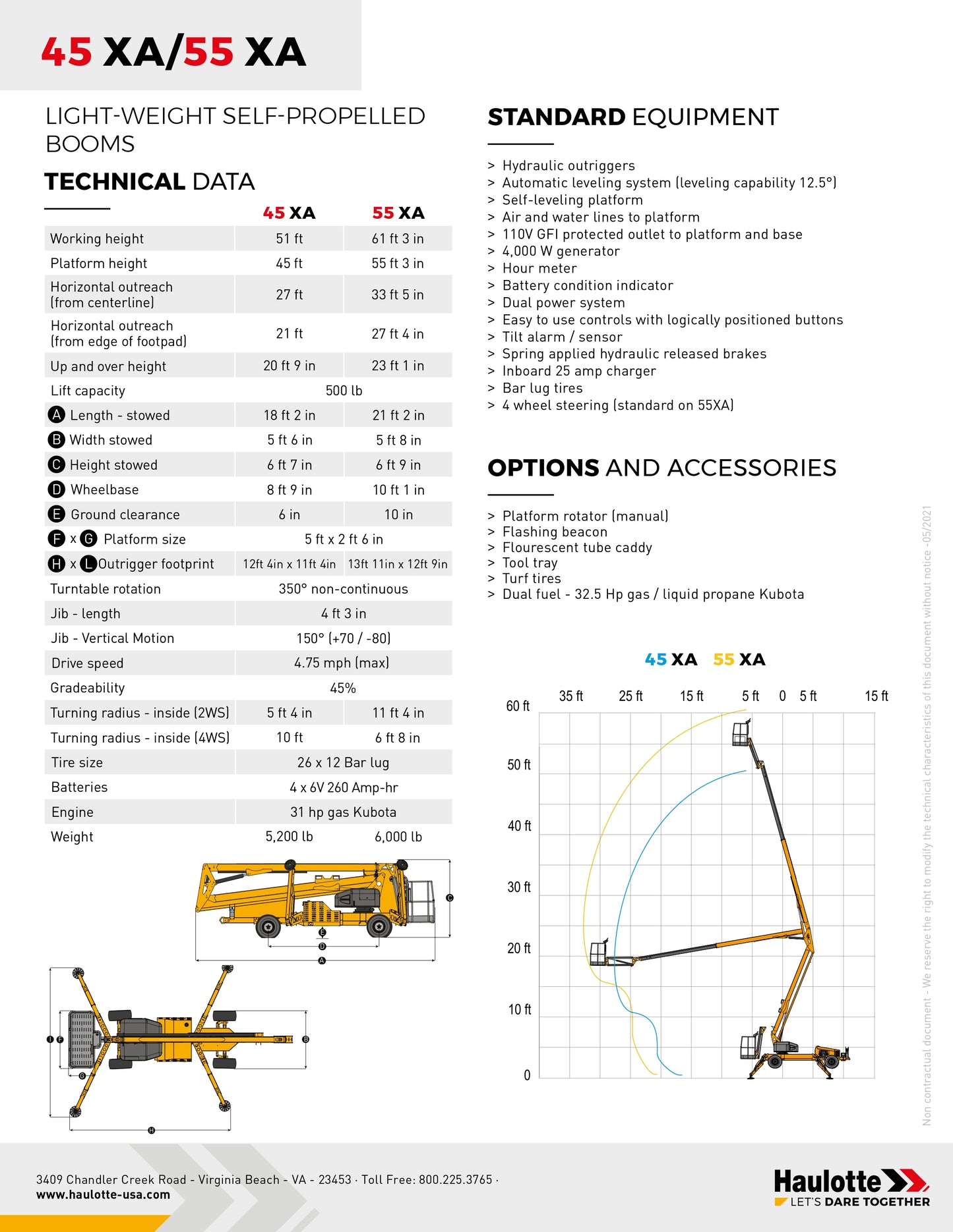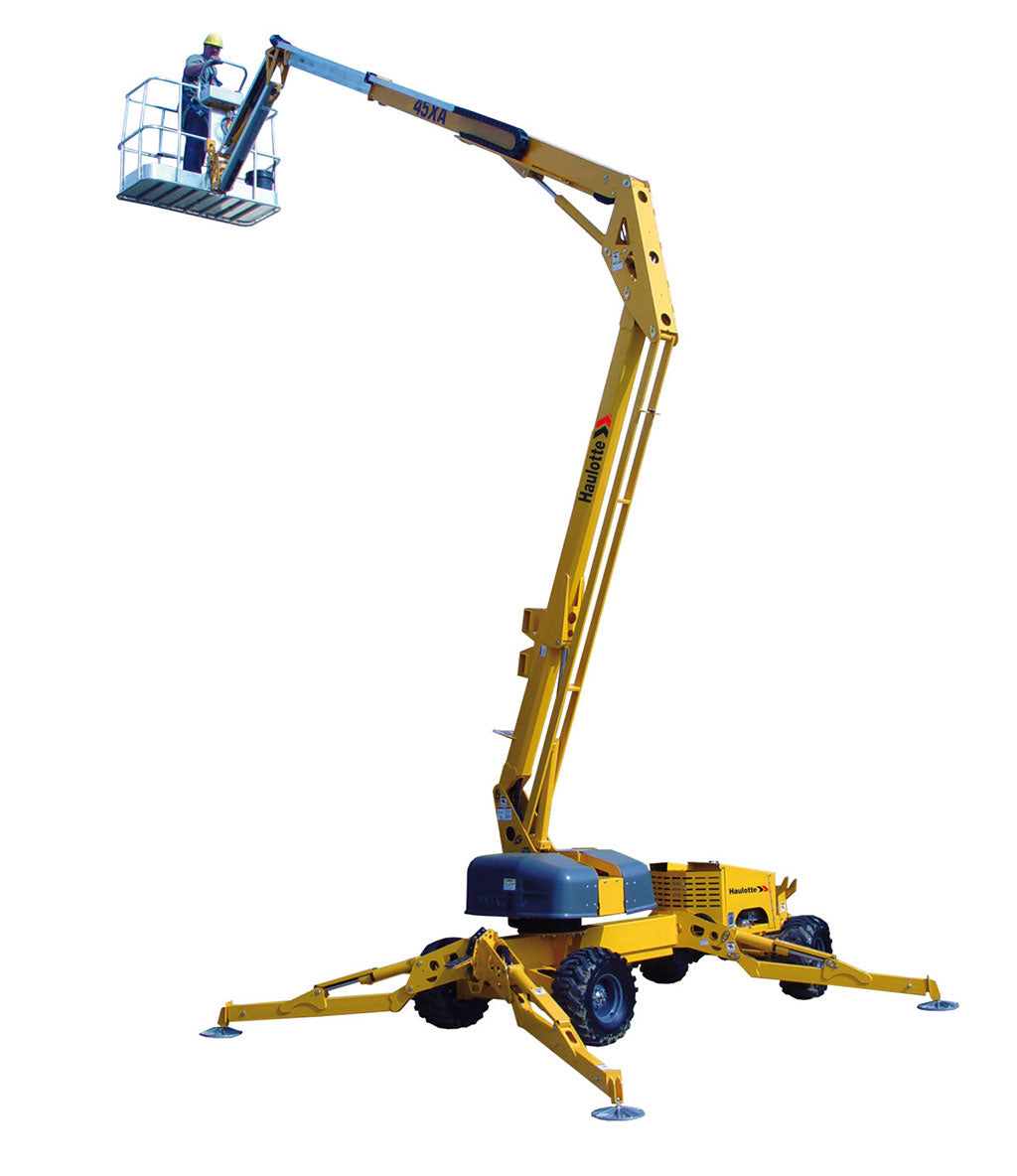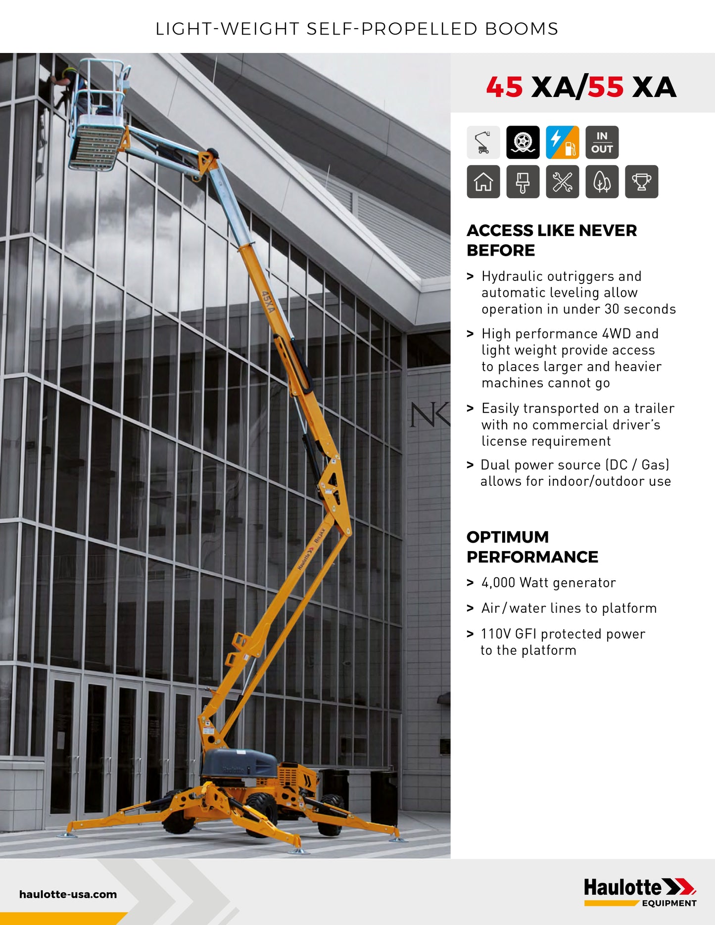 The Haulotte 45 XA is a versatile, 4x4 articulated boom lift with a 500 lb load capacity and a 51 ft 10 in working height, ideal for a range of applications. Featuring automatic leveling hydraulic outriggers, it ensures stability and safe operation on uneven ground. Its compact design and robust capabilities make it suitable for both indoor and outdoor tasks, providing reliable performance in diverse environments.