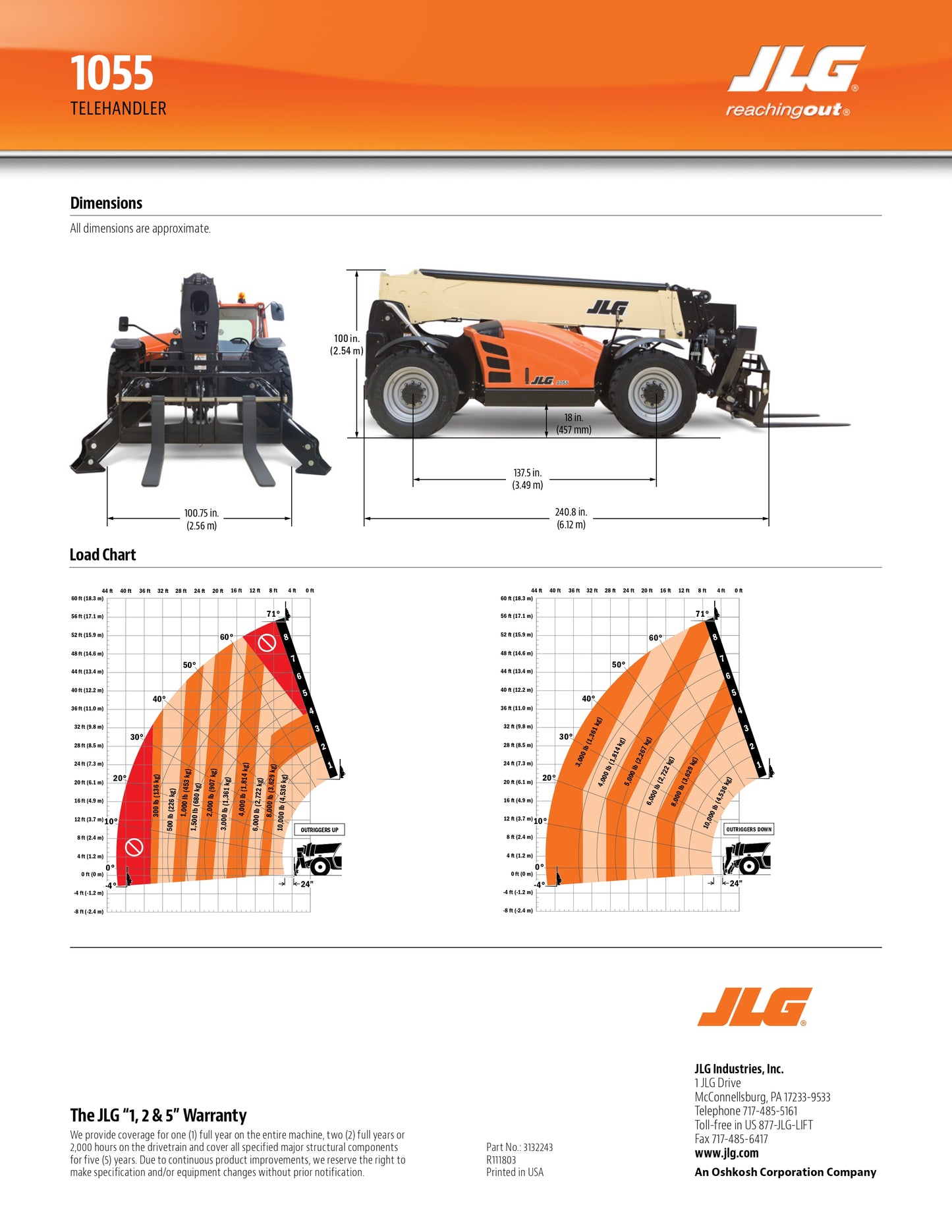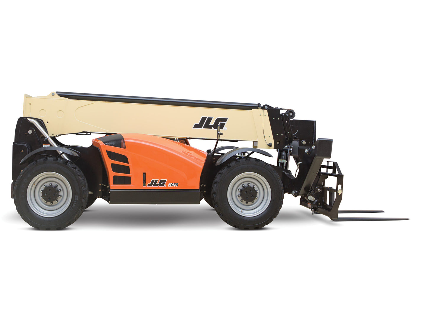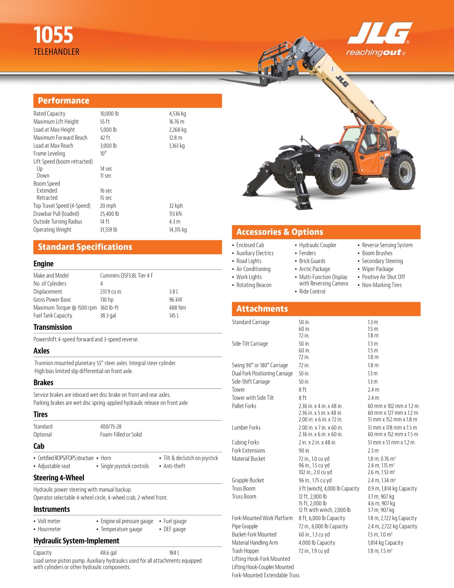 The JLG 1055 Telehandler is designed for enhanced operator comfort and confidence with features like a spacious cab, intuitive single joystick, and integrated armrest. It offers a maximum lift capacity of 10,000 lbs, a maximum lift height of 55 feet, and a maximum forward reach of 42 feet. Key capabilities include Stabil-Trak rear axle stabilization, precision gravity lowering system, and optional reversing camera. Additionally, it supports a wide range of attachments and comes standard with LED Motion/Amber Beacon and ClearSky Smart Fleet™ Connectivity Hardware.