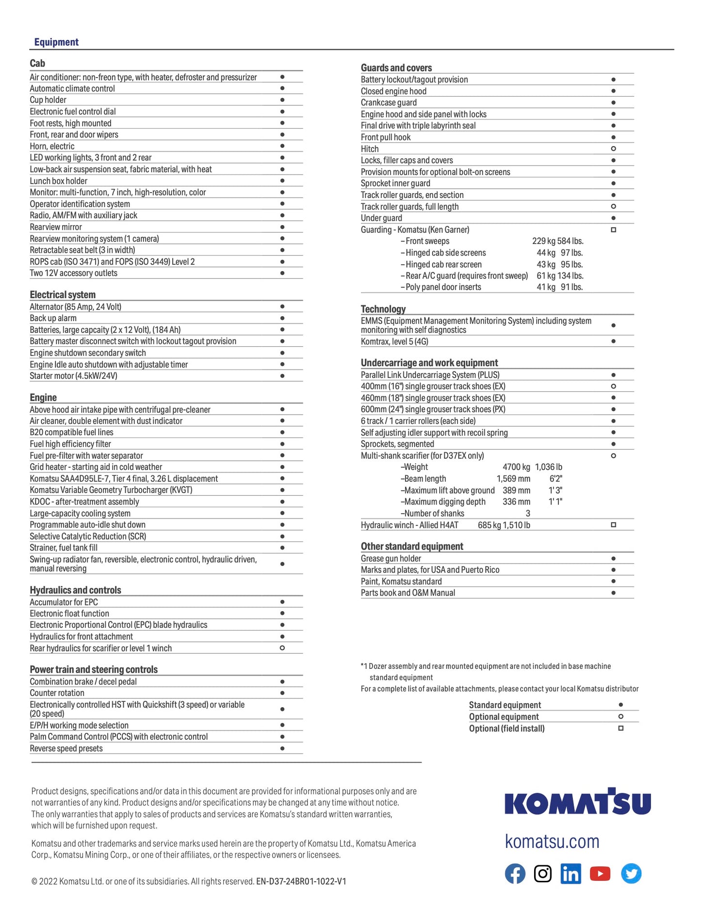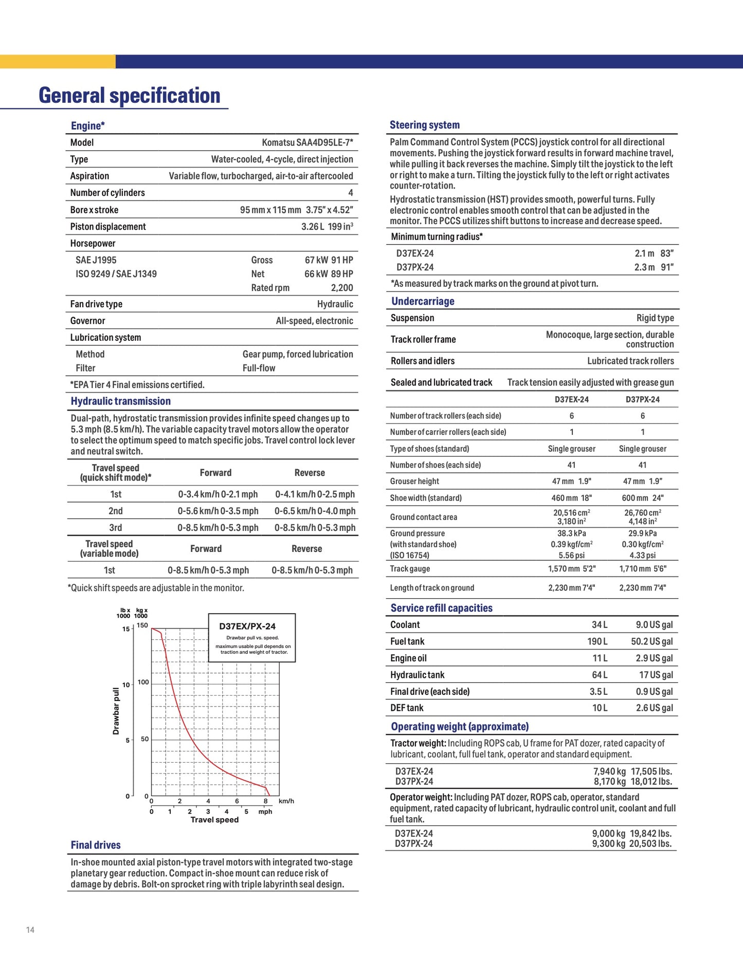 The Komatsu D37EX is a small dozer designed for high performance and operator comfort. It features a 91 HP engine and an advanced hydrostatic transmission for precise control and maneuverability. The dozer offers a new cab design with improved visibility and an air suspension seat, ensuring operator comfort during long work hours. It also includes Komatsu’s patented emissions technology, which meets stringent EPA Tier 4 Final regulations.