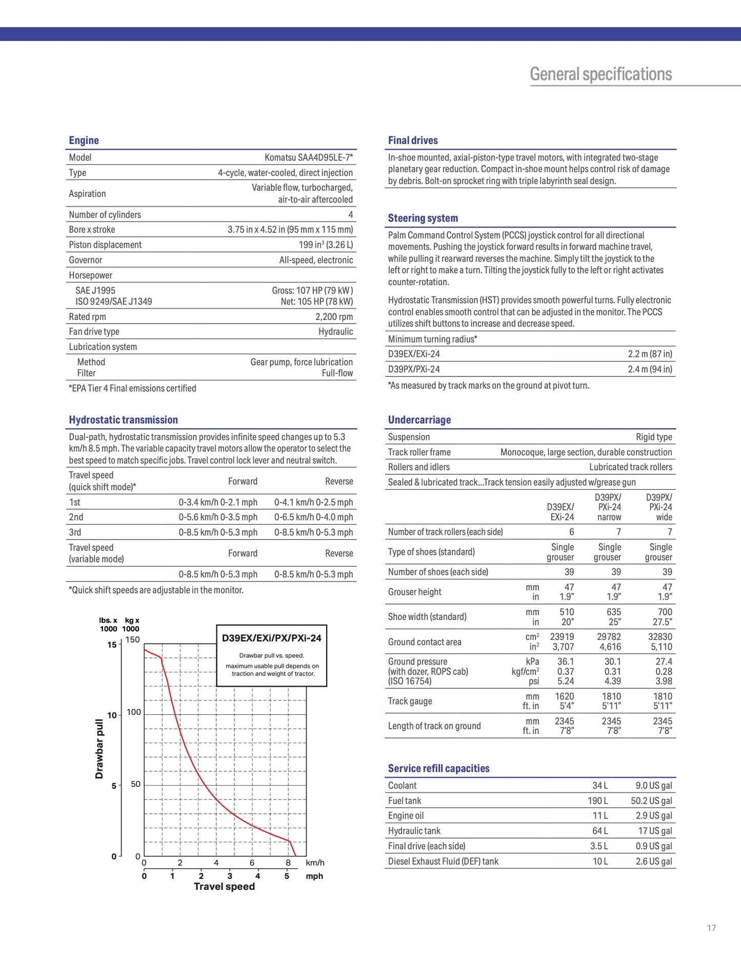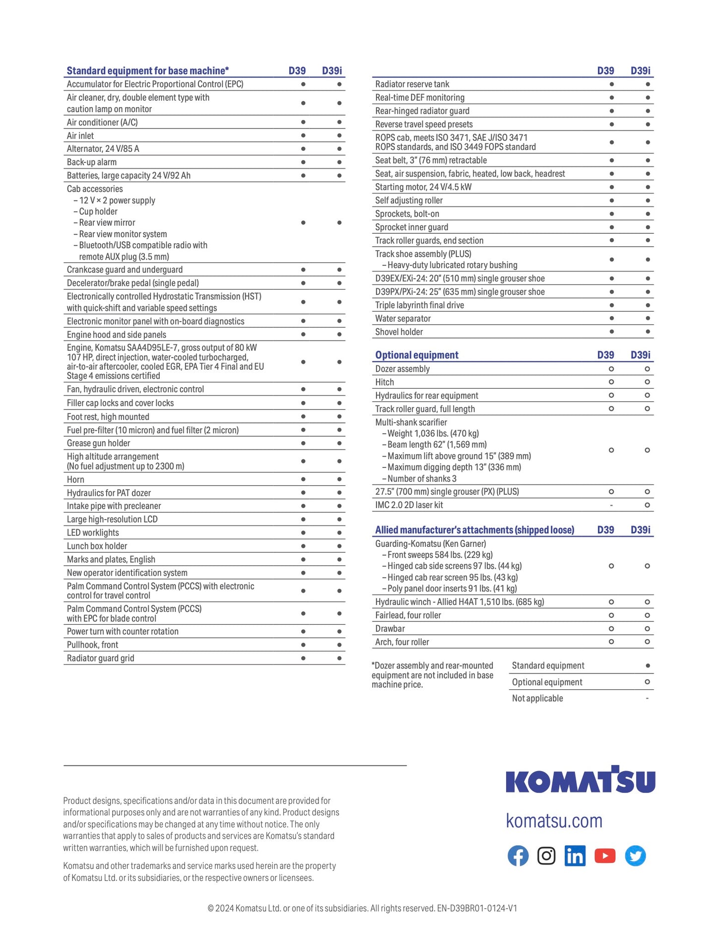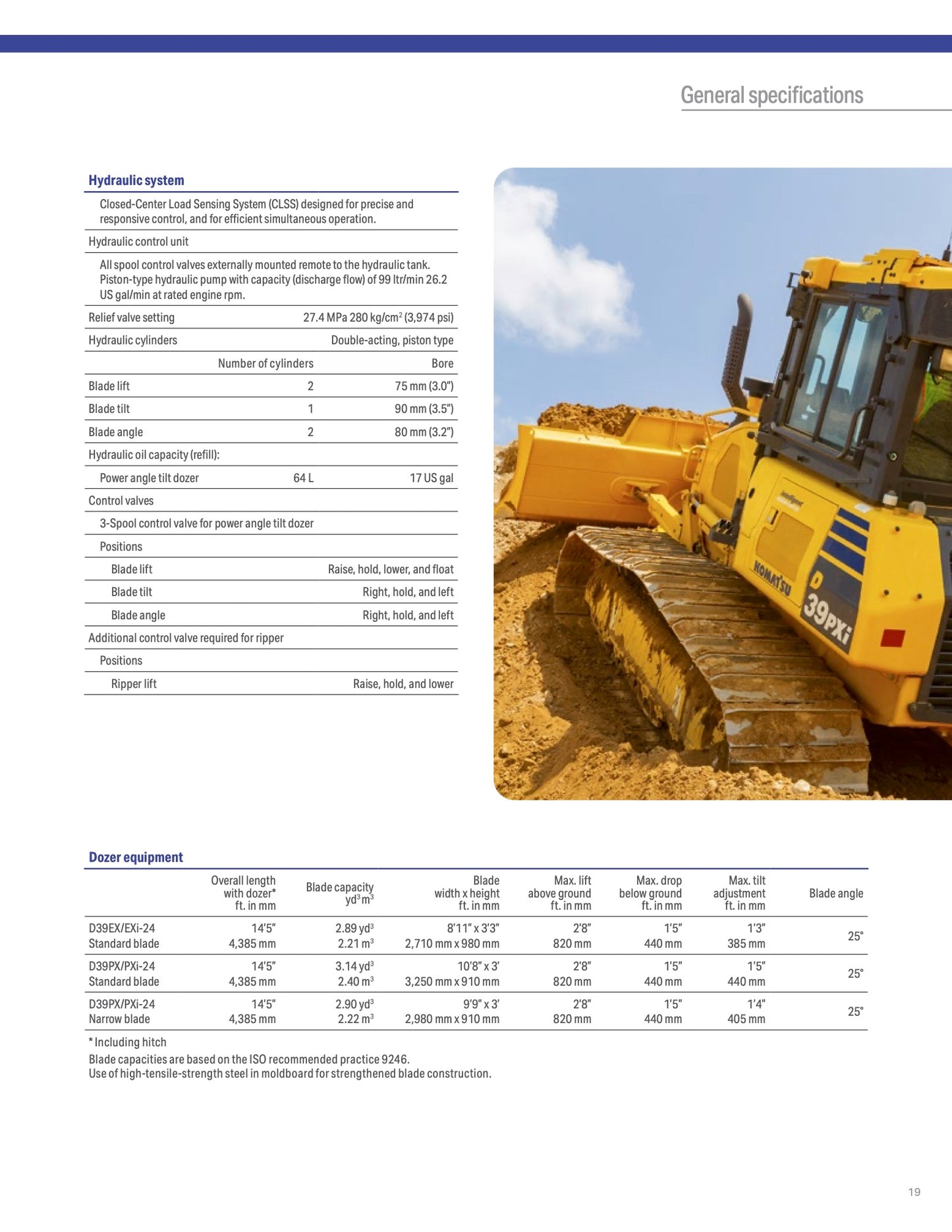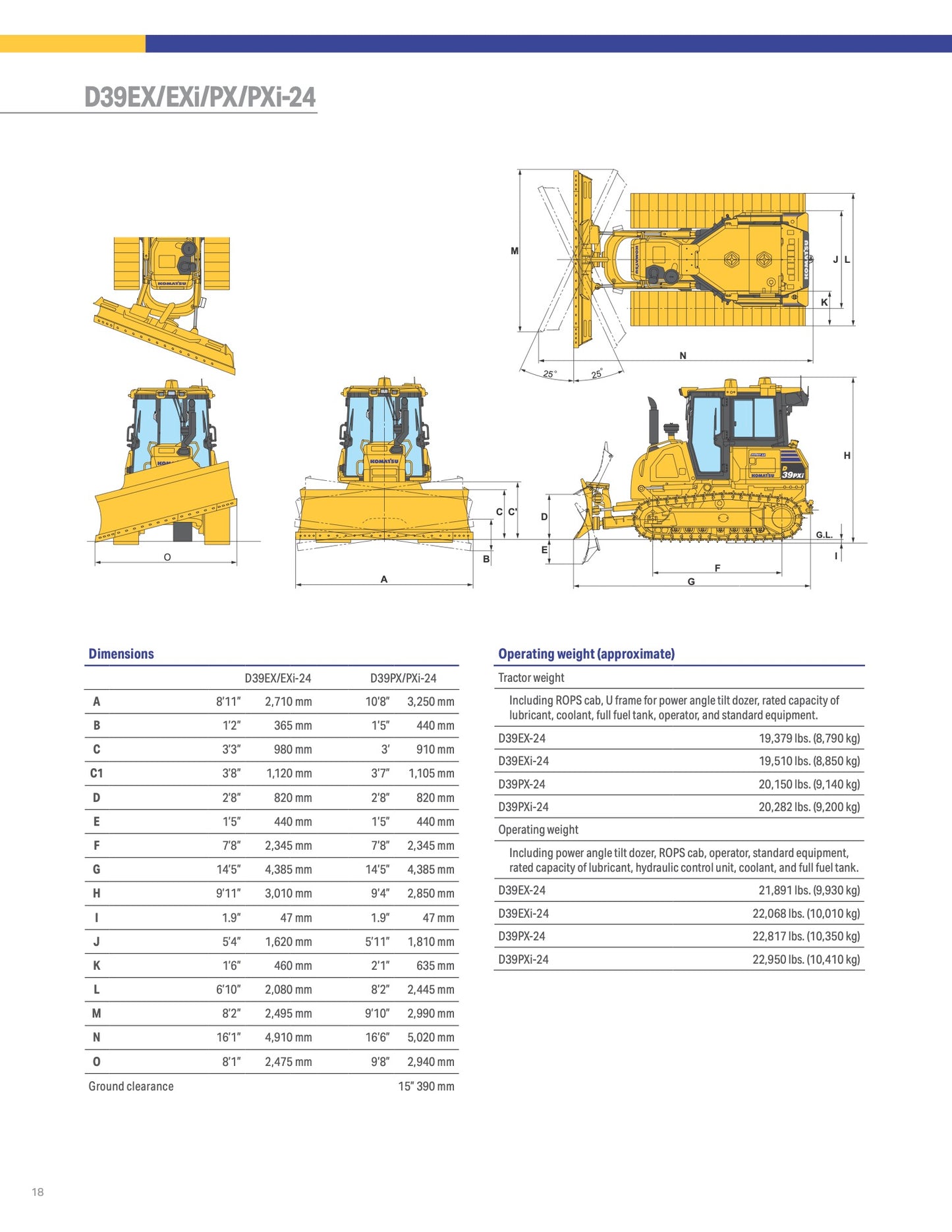 Stepping up in size and power, the D39 is a medium dozer suitable for a wider range of earth-moving projects. Similar to the D37, it offers a choice between standard tracks (EX) and low-ground-pressure tracks (PX) for enhanced performance on soft surfaces. With its increased muscle, the D39 can handle larger jobs like road-building or basement construction.