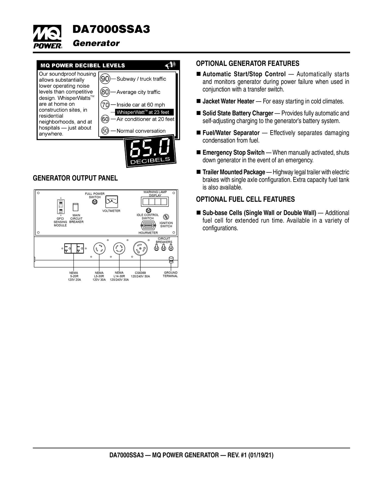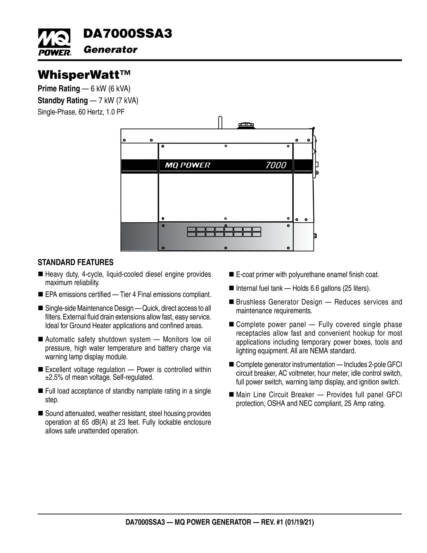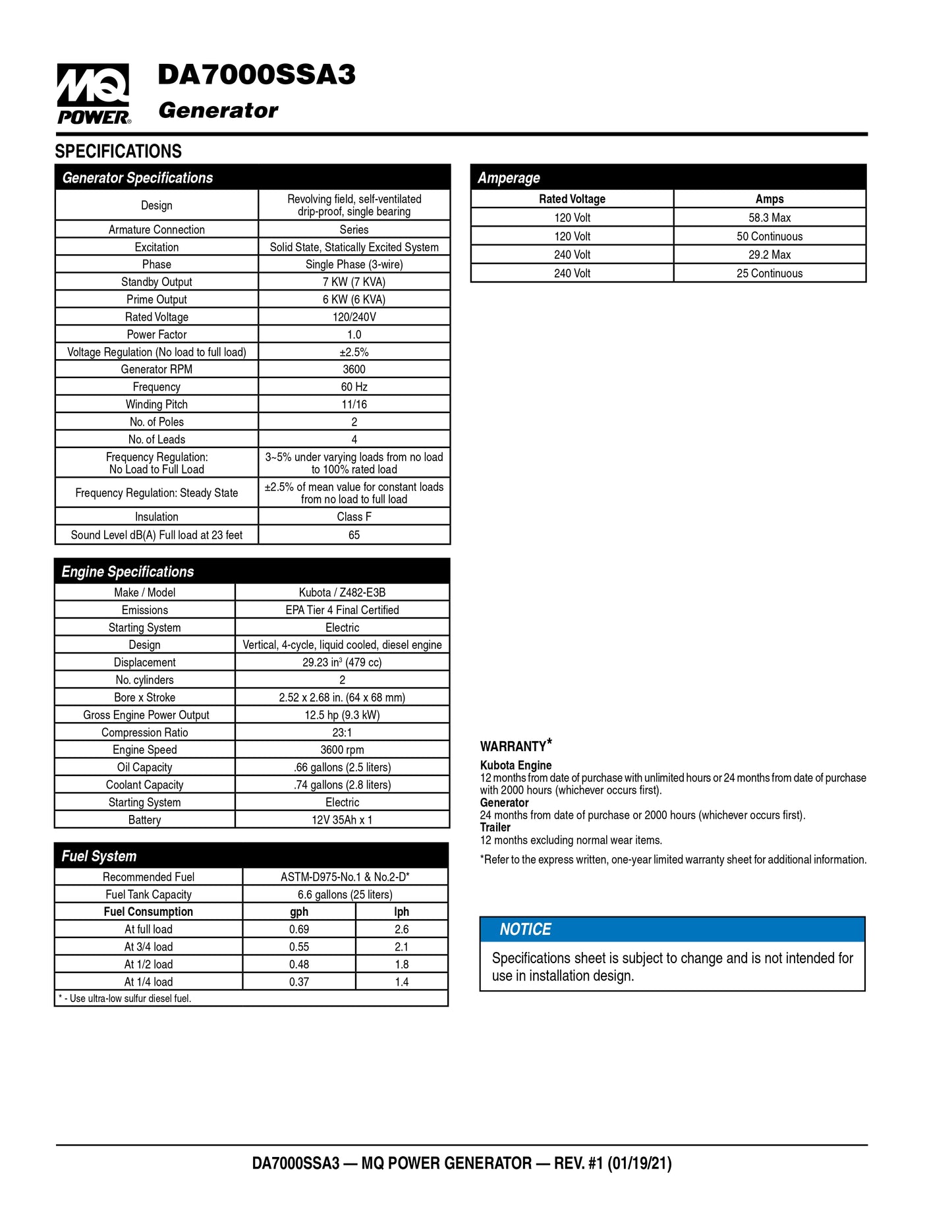 The Multiquip DA7000SSA3 is a 7kW single-phase generator with a 120/240V output and a 1.0 power factor. It features a Kubota Tier 4 Final engine, a mechanical governor maintaining 60 Hz frequency within 3-5% from no load to full load, and a sound level of 65 dB(A) at 23 ft. The generator is designed for durability and ease of maintenance with a single-side maintenance design and a comprehensive control panel. It weighs 534 lbs, includes a steel frame, electric start, and has a towable option.