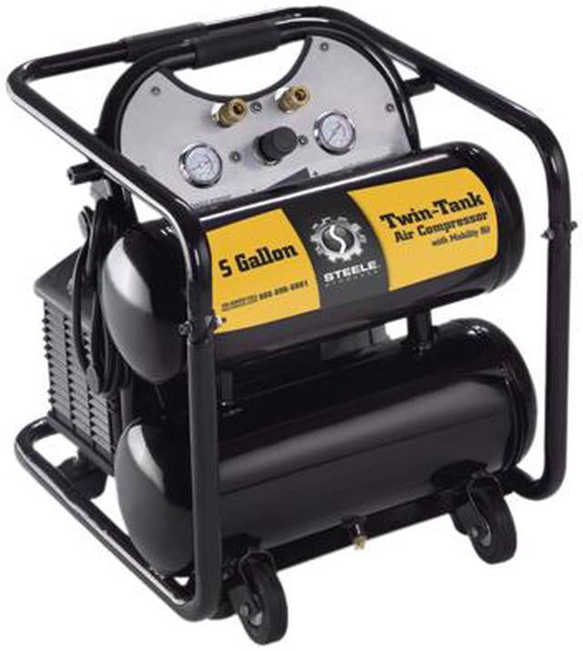 This is an electric air compressor by Steele featuring two 5-gallon tanks for a total capacity of 10 gallons. This design allows for extended use compared to a single 5-gallon tank model while maintaining a relatively compact size. The Steele 5 Gallon Twin is suitable for powering air tools for various DIY projects or light-duty workshop tasks.