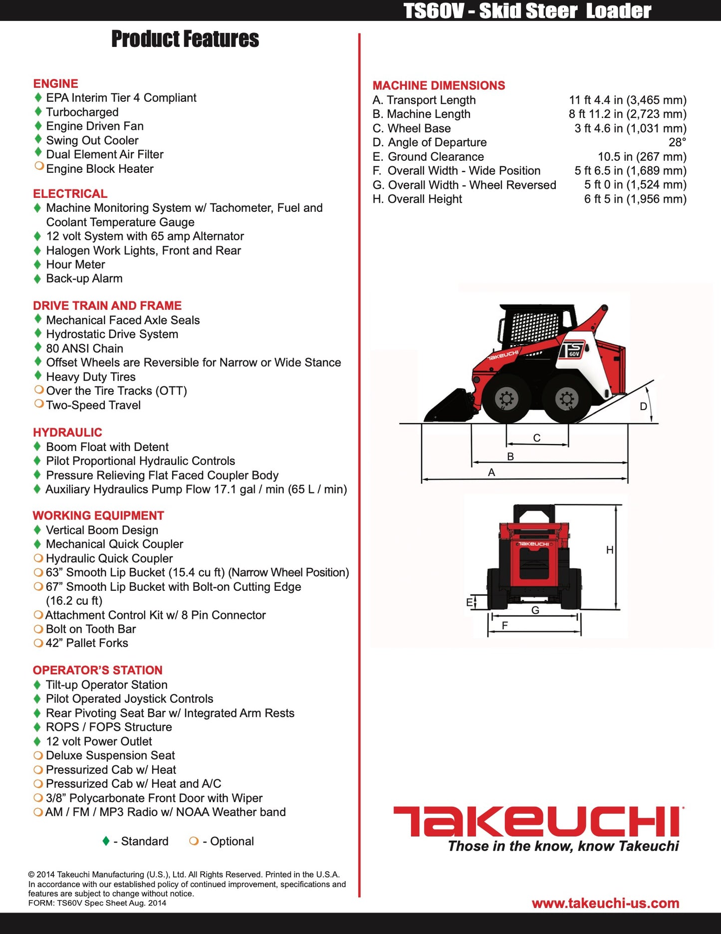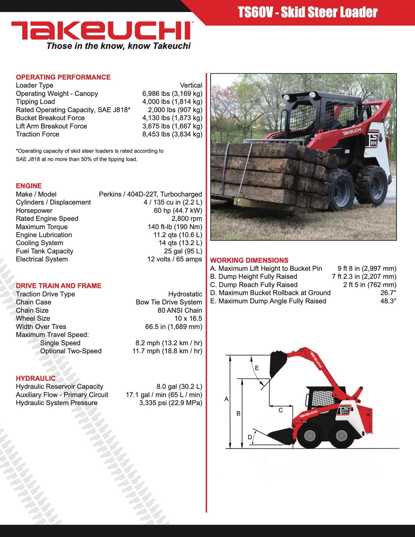 Takeuchi offers a range of compact track loaders in various sizes and configurations (designated by the numbers in the model name, with TL230 being the largest). These machines are known for their maneuverability and performance on rough terrain, making them suitable for landscaping, excavation, or working on slopes. Takeuchi track loaders are built with a reputation for reliability and durability.