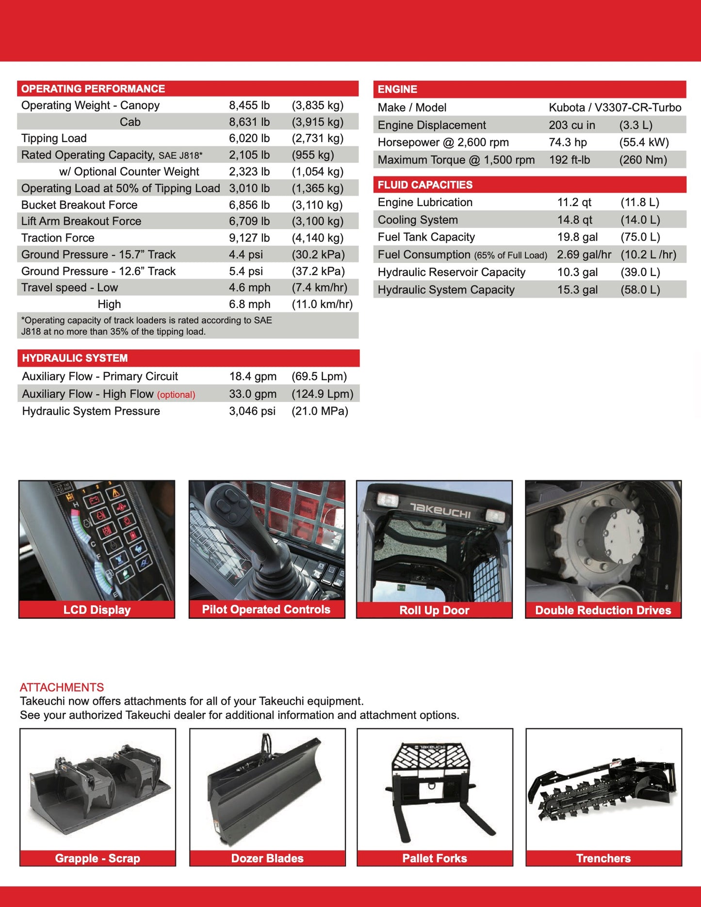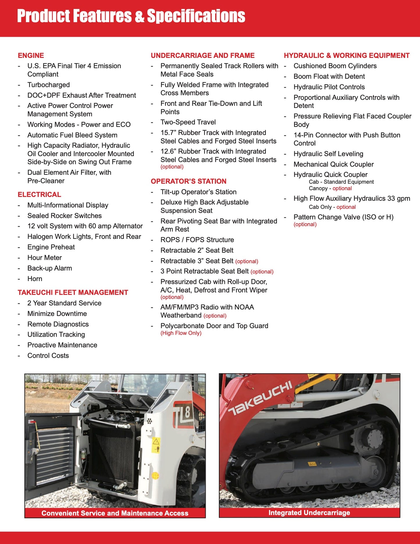 Takeuchi offers a range of compact track loaders in various sizes and configurations (designated by the numbers in the model name, with TL230 being the largest). These machines are known for their maneuverability and performance on rough terrain, making them suitable for landscaping, excavation, or working on slopes. Takeuchi track loaders are built with a reputation for reliability and durability.
