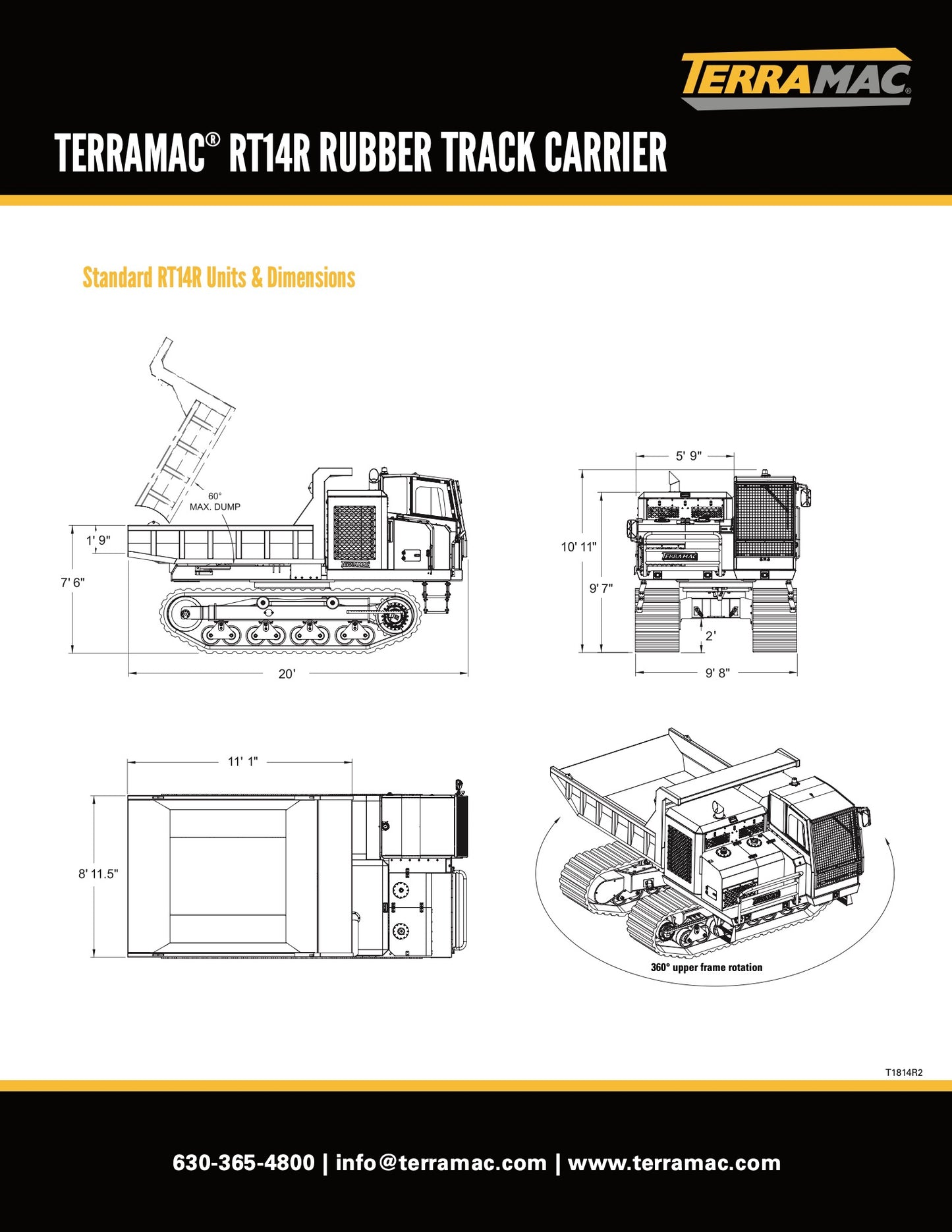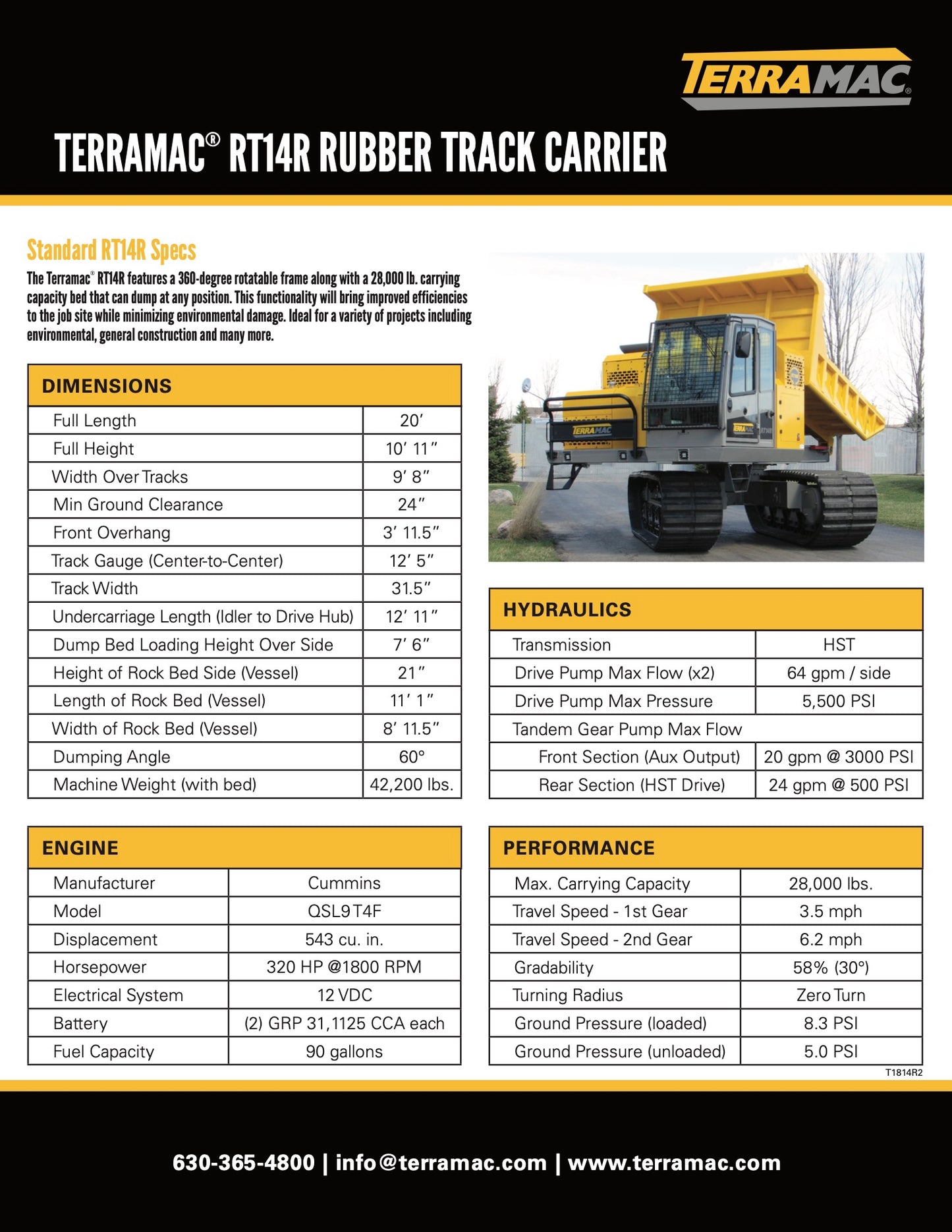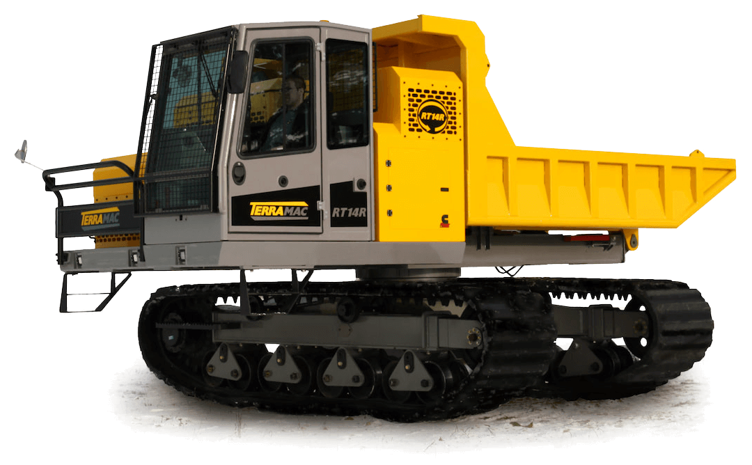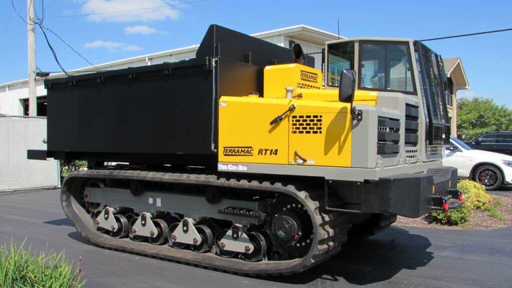 The Terramac RT14 is a robust rubber-tracked crawler carrier designed for heavy-duty operations in challenging environments. It features a powerful Cummins engine that delivers 320 horsepower, ensuring efficient handling of its 28,000 lbs. carrying capacity. The RT14's advanced hydrostatic transmission provides enhanced performance and maneuverability. Equipped with standard safety features such as ROPS and FOPS, the RT14 prioritizes operator safety. The carrier's intuitive ISO joystick controls facilitate precise operation, while the machine's ability to rotate 360 degrees enables efficient offloading from any angle.