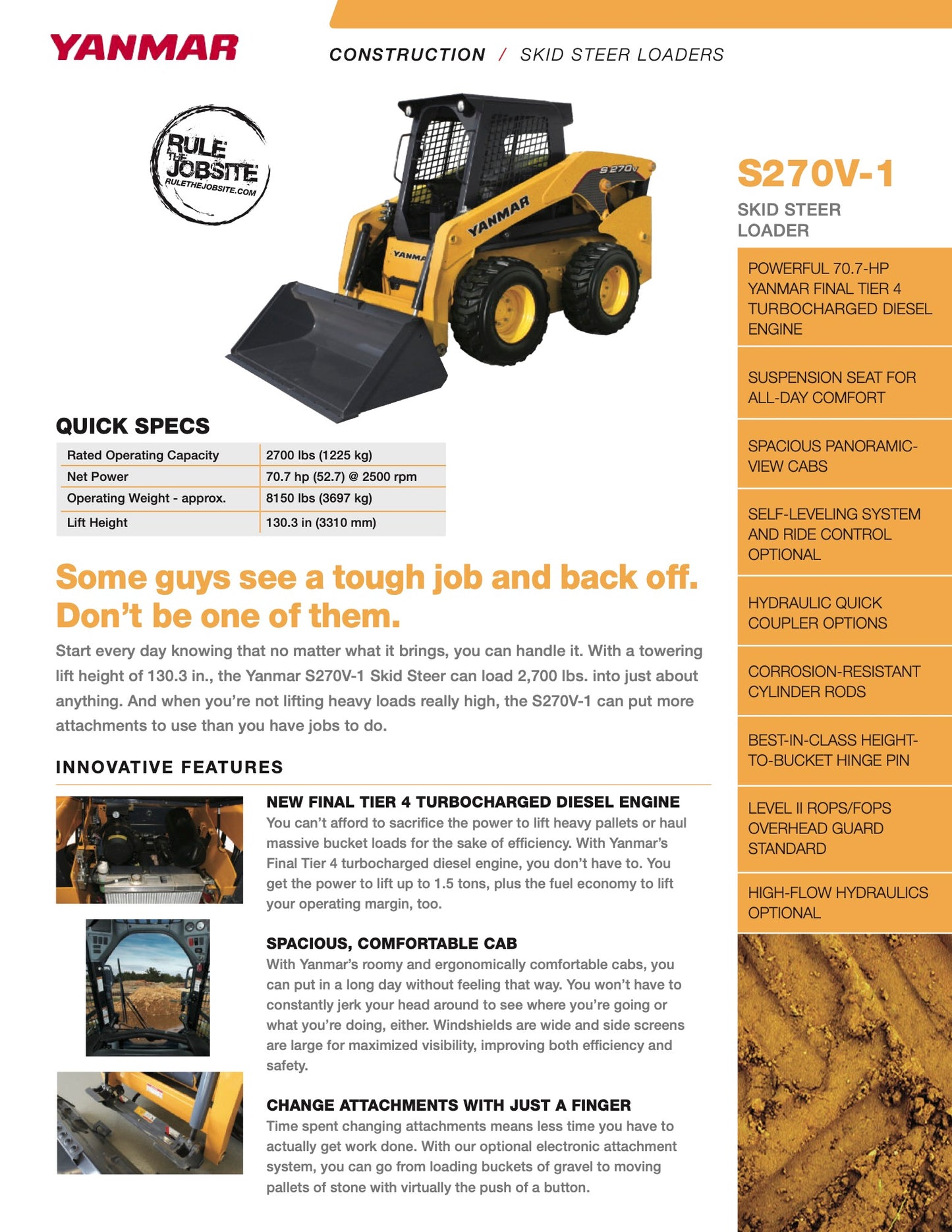 The Yanmar S270V-1 Skid Steer Loader offers a rated operating capacity of 2,701 lbs and a powerful 71 hp engine. It features a dump height of 8 ft, ground clearance of 8 inches, and a maximum speed of 12 mph. With a fuel capacity of 20 gallons, it supports a hydraulic flow of 24 gpm and has an operational weight of 8,151 lbs. The compact design includes a height of 81 inches with ROPS and a wheelbase of 4 ft, making it suitable for various construction tasks.