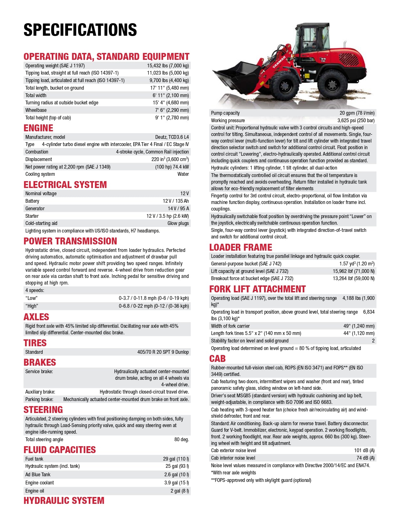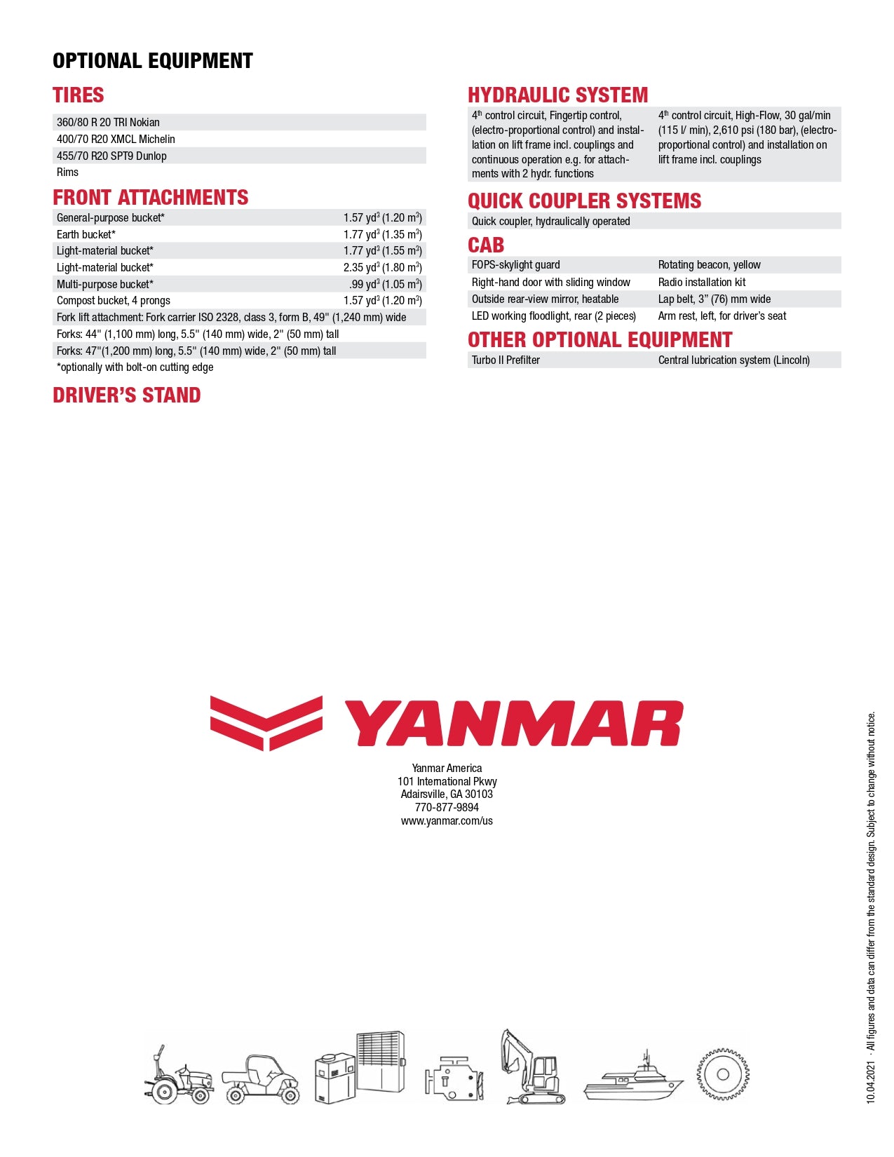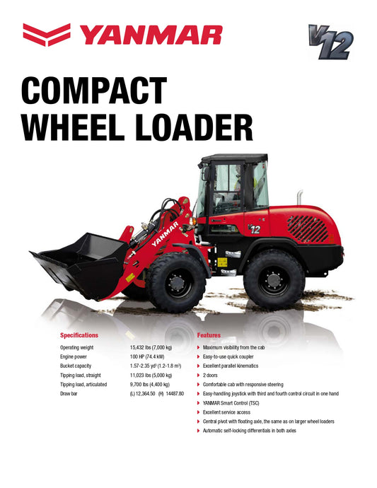 FOR SALE: The Yanmar V12 wheel loader is powered by a 100-horsepower, Tier 4 Final turbocharged diesel engine. It features a hydrostatic drive that optimizes speed and torque, a single-pin articulation for stability and precise steering, and an oscillating rear axle for smooth operation on uneven terrain. The machine includes intuitive joystick pilot controls and a comfortable operator seat with wide visibility. It has a bucket capacity of 1.57 to 2.35 cubic yards and an operating weight of 15,432 lbs. Price shown below for the model we carry.